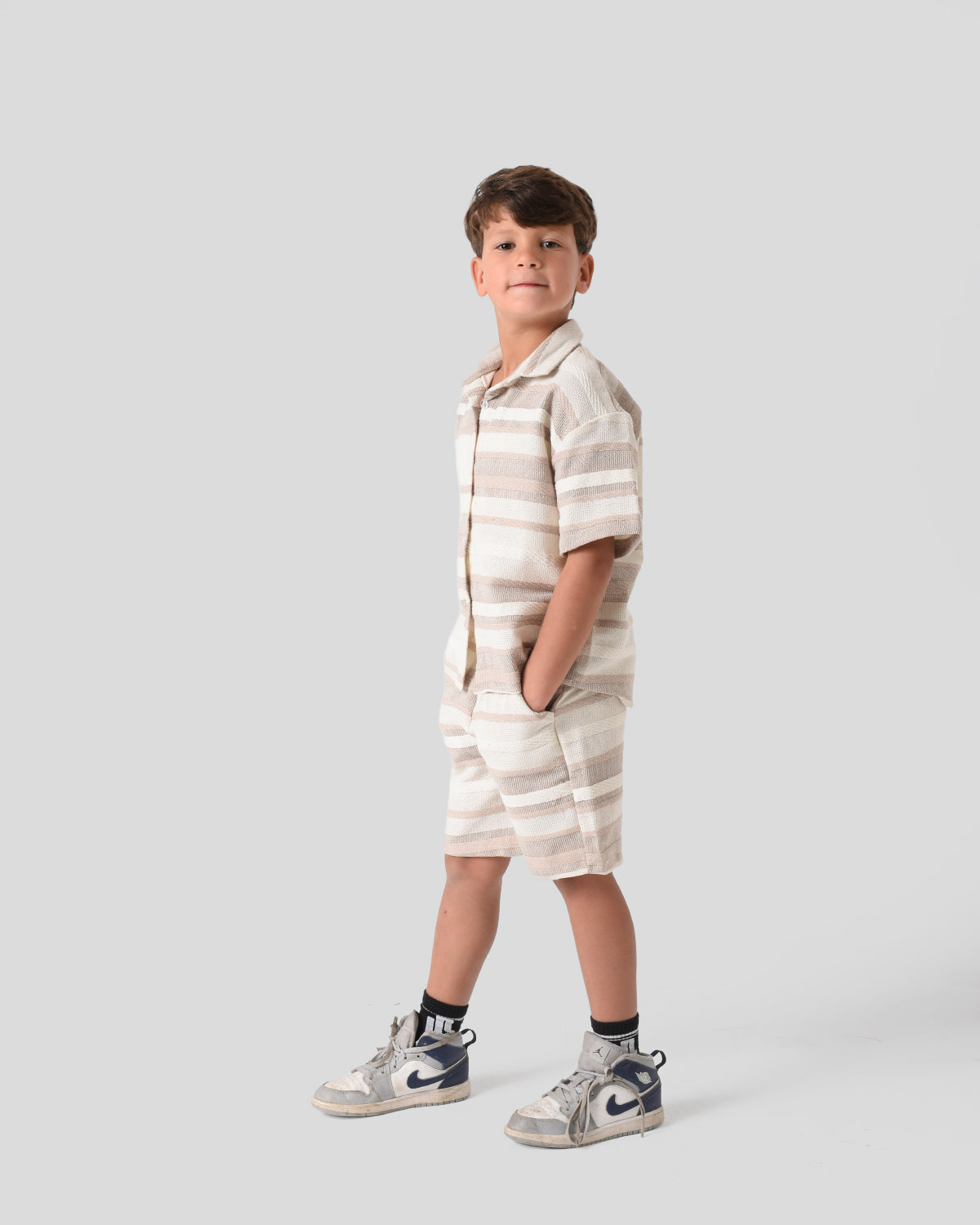 A tailored summer co-ord inspired by woven simplicity. The Loom Set features a short-sleeve shirt and matching shorts, crafted from breathable textured cotton with vertical yarn-dyed stripes. The shirt is designed with a relaxed, boxy cut and a clean camp collar, while the shorts have an elastic waistband for comfort and side pockets for ease. Structured yet soft — this set brings together utility and ease in equal measure.