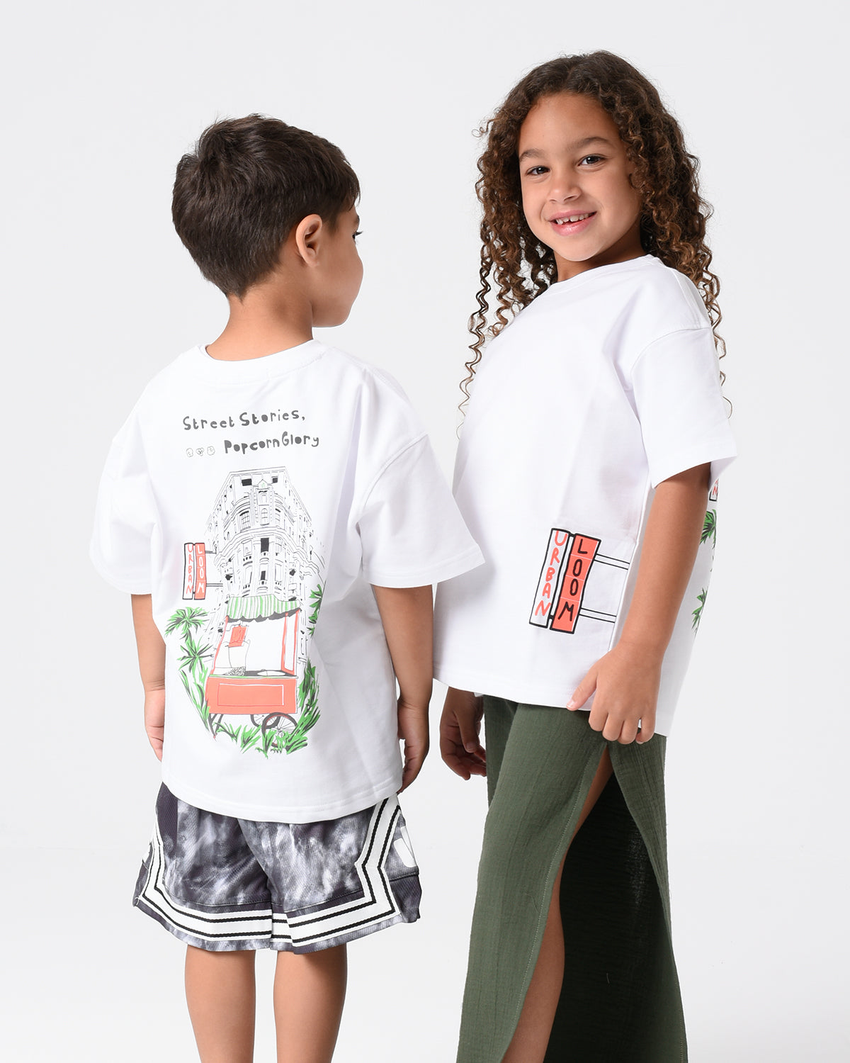 A nostalgic summer staple. The Popcorn Glory Tee features a vintage-style illustration on the back of a Cairo street scene, with a popcorn cart and downtown building. The front includes a faux advertisement print for Urban Loom on the left chest.