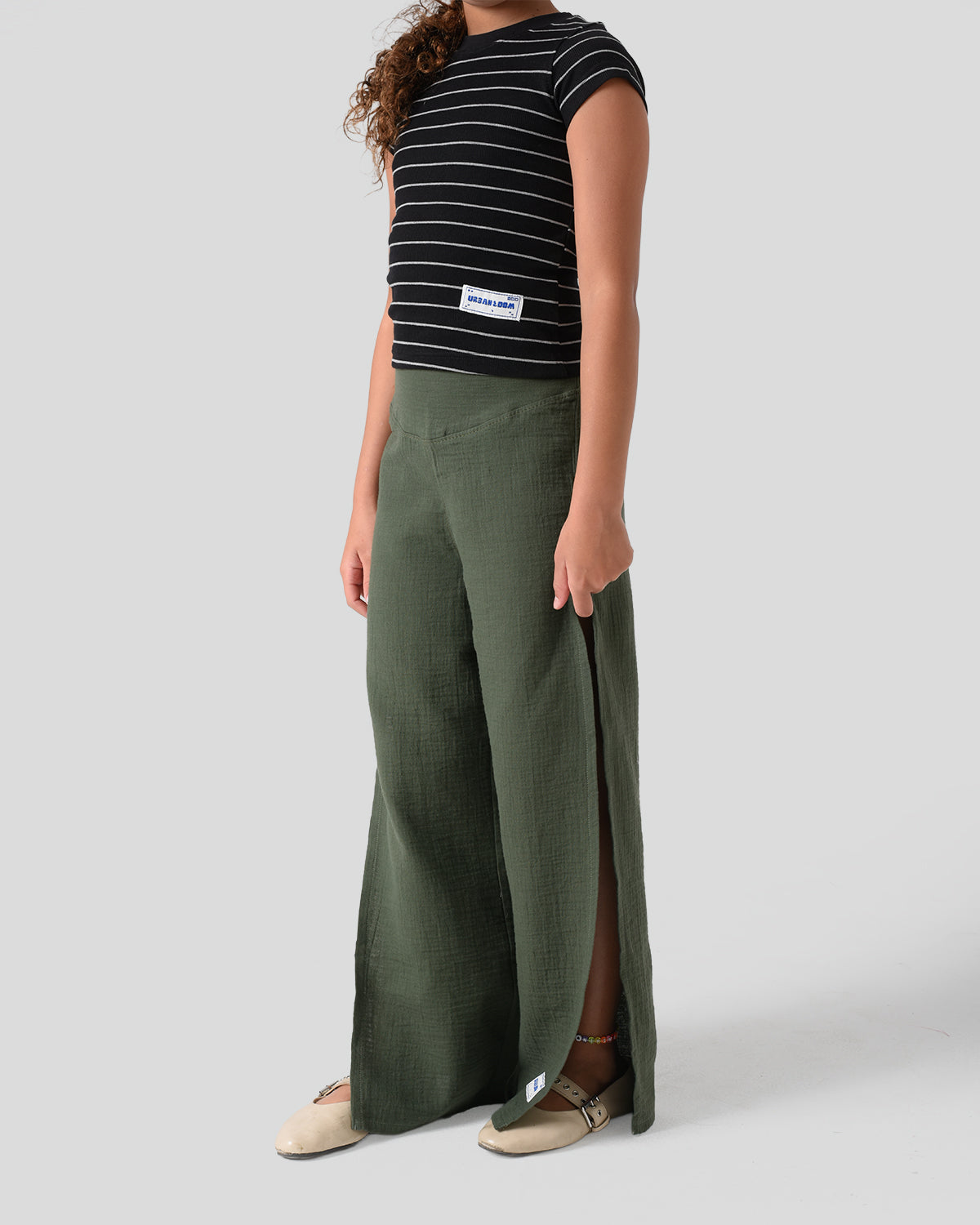 Designed for movement and style, the Sway Pant is a girls-only piece with unique side openings that run along the outer leg. Made from crinkle fabric with a tone-on-tone stripe texture, these pants offer a flowy, relaxed silhouette perfect for sunny days.