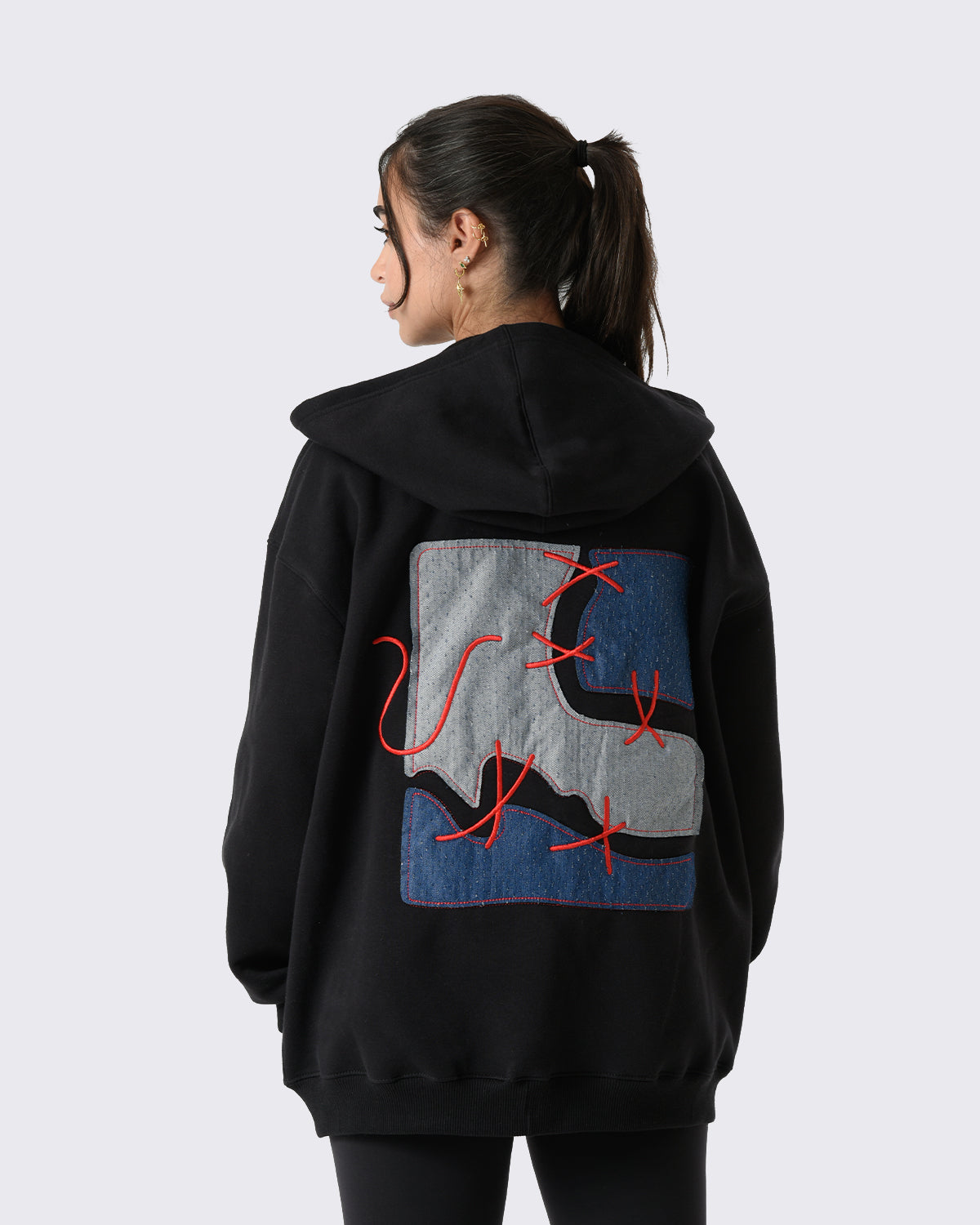 The back features a signature denim patch panel, crafted from upcycled denim and securely applied with bold cross-stitching and embroidery. The result is a clean, intentional deconstructed look that adds depth and personality — and remains consistent across every piece in the collection.